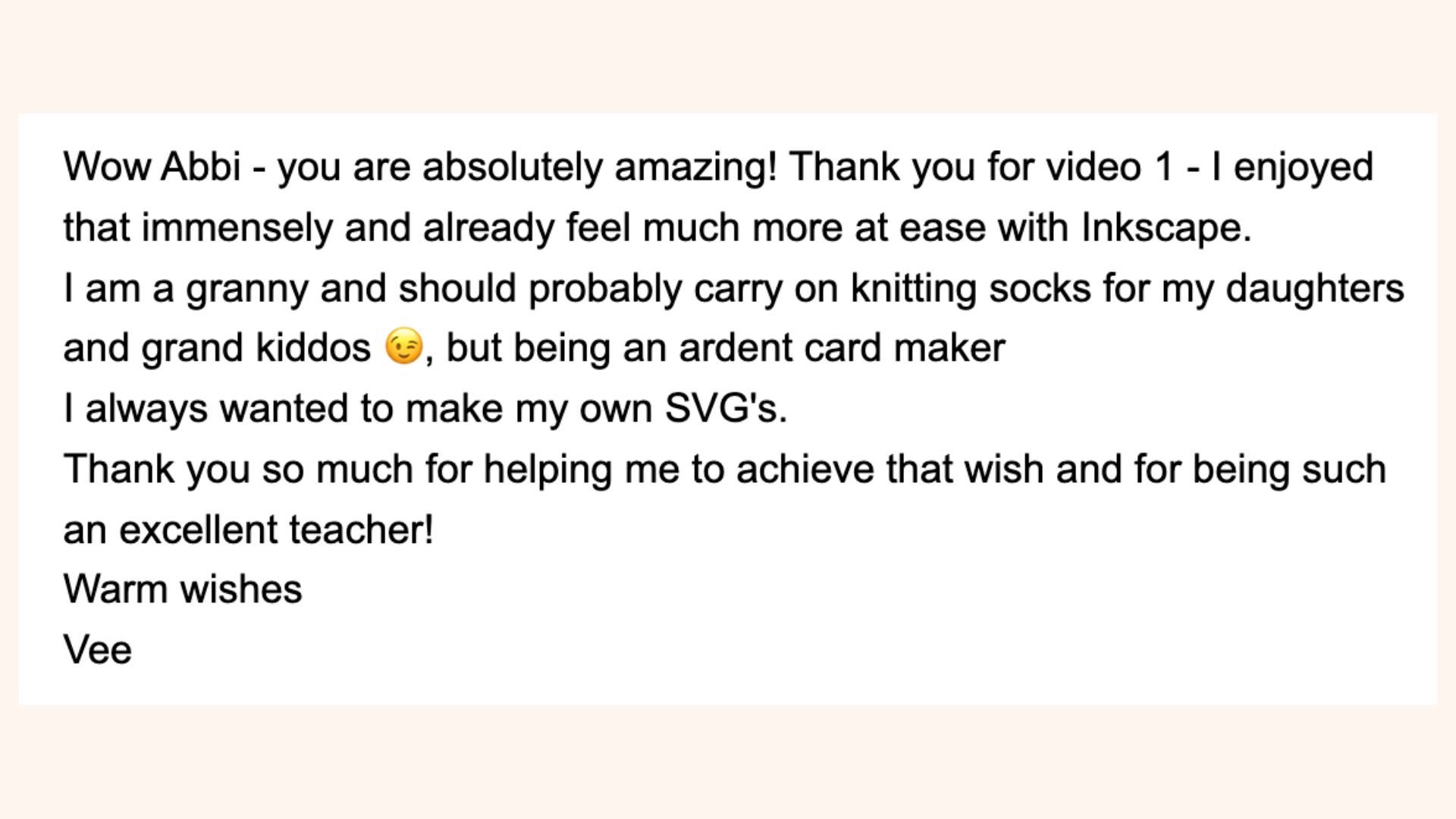 If you are like our student, Vee, below, and all our other creators already inside SVG by Design, you won't want to miss the freedom, time, and money-saving move of learning to create your own SVG files for your cutting machines! But this opportunity will only last until 11:59 pm ET on 12/2, and the 30% savings will never be offered again! Use code: SAVE30OFF when you pay in full. Get Unlimited Access to All SVG by Design Lessons and Start Designing TodayHave a question? Hit reply, and I will respond as soon as I am able. See you there! Abbi |